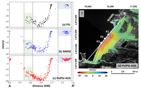 The selected pixels along with a profile (from A to A’) over the XiaoLangDi obtained by the (a) PSI, (b) MMSE, and (c) PolPSI-AOS, respectively. The location of the profile is shown in (d) by the white line over the PolPSI-AOS retrieved displacements. The three filled dots in (d) indicate locations of the pixels selected for time-series deformation analysis in Figure 16. It is worth to note that (d) is in UTM (Universal Transverse Mercator) coordinate.