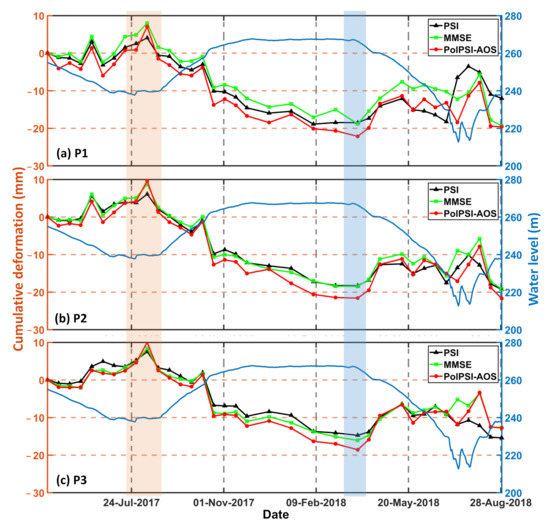 To analysis the relationship between the dam deformation and water level of the reservoir basin, deformation time-series of three pixels (i.e., P1, P2, and P3) along the profile in Figure 15d have been depicted together with the corresponding water level in Figure 16. It can be observed from Figure 16 that the three methods obtained time-series are very similar in general. In addition, the time-series deformation is negatively correlated with the water level for all the three points. As the reservoir basin water level periodically changes, the dam is supposed to with periodic deformation trend. Specifically, when the water level increases the dam move away from the satellite (i.e., the cumulative deformation decreases) and vice versa. Moreover, the local maximum values of water level are always corresponds to the local minimum values of the cumulative deformation and vice versa (see the brown and blue filled rectangles highlighted sections in Figure 16). This indicates that the deformation of the dam is mainly caused by the change of the reservoir basin water level, and it can also prove the effectiveness of the employed three deformation monitoring methods.