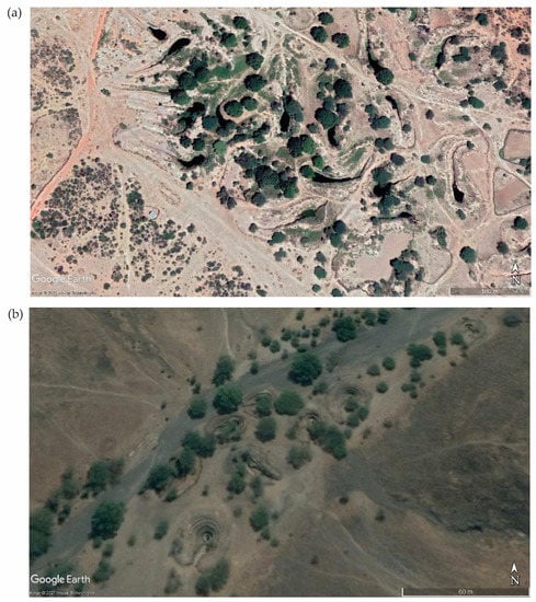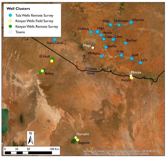 The wells in Ethiopia (known as tula wells) were initially identified during fieldwork undertaken by Waktole Tiki [30,40,41]. Working from these published maps of their distribution, the image overlay function was used in Google Earth to approximate the wells’ positions, then manual identification of the wells was made using visual inspection. The wells in Kenya were initially located by field survey and georeferenced using differential GPS by a team from the British Institute in Eastern Africa led by Freda M’Mbogori in 2019. This survey was subsequently extended remotely, using the Google Earth Pro platform. Nineteen clusters of traditional wells were identified in the study area (four clusters with n = 235 wells in Marsabit region, and fifteen clusters with n = 327 wells in Borana region) (Figure 4) and digitised from high resolution imagery within the Google Earth Pro platform and ground survey verification exercises.