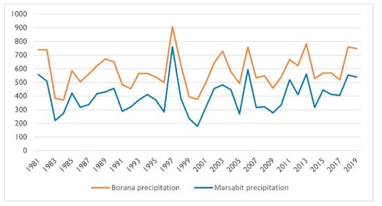 Average annual precipitation for the years 1990–2020 in the Marsabit region (blue) and in the Borana region (orange) (Source: CHIRPS dataset (Funk et al., 2015)).