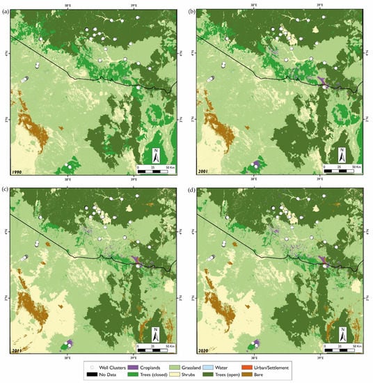 The gradual increase in croplands within the well clusters in this region indicates an expansion of cultivation within this study area, which is a departure from the traditional livestock-keeping practices of the inhabitants of the area. It was found by Mgalula [71] that croplands were rapidly expanding in the Borana rangeland due to several potential drivers. Decrease in pasture, recurrent droughts, income diversification, and food insecurity were found to be the main reasons for the expansion of cultivated areas [71]. Extreme droughts during the early 1980s and 1990s resulted in massive losses of livestock herds which brought about diversification into cultivation activities in the area.