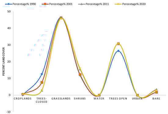 Changes in the land cover matrix for each epoch are shown in Figure 7 and Table 5. Figure 7displays the proportions of land covers in the study region between 1990 and 2020, while Table 5 indicates the area coverage in km squared for each land cover. Our study shows that grasslands dominated the land cover throughout the study period (46%) whereas open trees (~30%), shrubs (~13%) and closed trees (~7%) followed in magnitude. The results also show that the urban/settlement (<0.1%) and cropland (<1%) land covers were the lowest in the region throughout the study period. Table 5 demonstrates that the closed tree cover class underwent a steady decline from 1990 to 2011 (7780 km2), but the area covered increased slightly by 2020. Conversely, the open tree cover class increased gradually from 1990 to 2020 by 3507 km2, a fact that can be attributed partially to the decline in the closed tree cover. Moreover, the shrubs also gradually increased from 1990 to 2020 by 3244 km2 representing a 34% growth. Bare lands also gradually increased during the study period by 1020 km2. The area covered by water increased greatly from 14 km2 in 1990 to 42 km2 in 2020. This increase in surface water could be due to the unusually high rainfall experienced in the region in the year 2020. Among the human-transformed landscapes, i.e., croplands and urban/settlements, there was a gradual and expected increase in area of land covered, particularly the croplands class which experienced a 110% increase from 1990 to 2020. In general, the grasslands class maintained an almost constant area in the landscape, reducing only marginally by approximately 0.01% from 1990 to 2020.
