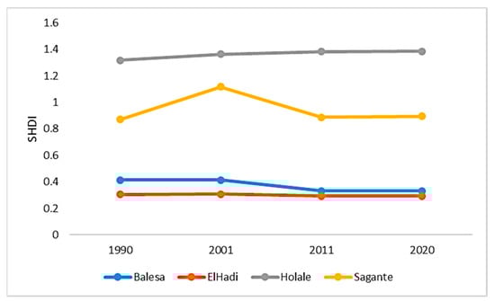 Mean SHDI within a 15 km buffer zone of Marsabit wells clusters in the Northern Kenya/Southern Ethiopia study region. The y-axis indicates the SHDI values while the x-axis indicates the year.