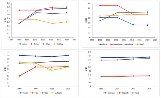 Mean SHDI within a 15 km buffer zone of the tula wells clusters in the Northern Kenya/Southern Ethiopia study region. The y-axis indicates the SHDI values while the x-axis indicates the year. The figures have been separated into four frames for ease of visibility.