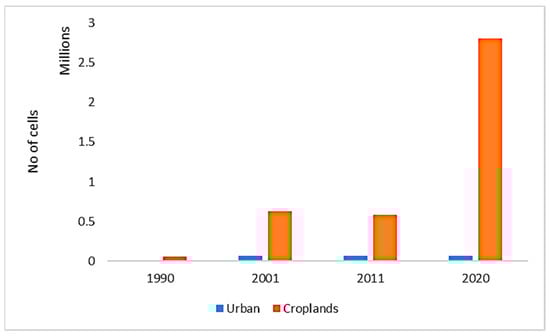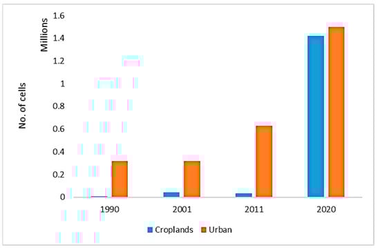 Number of cells for the urban/settlement and croplands land cover classes within the Erdar wells cluster shows increasing areal cover through the years.