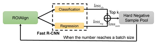 48]. Moreover, the positive sample number is set to 256 to avoid falling into the local optimization of a certain positive or negative category. When the sample number in the pool reaches a batch size, they are mapped into the feature map by ROIAlign again to be trained repeatedly and emphatically. In this way, Fast R-CNN is able to learn more representative background features to further suppress false alarms. More details can be found in [