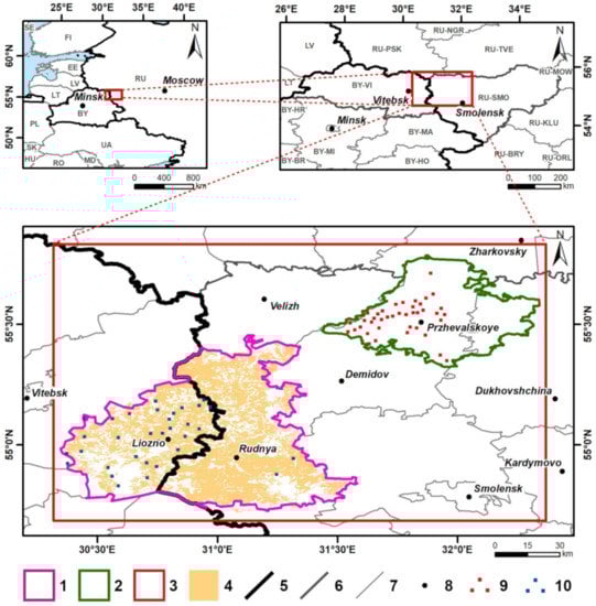 The Rudnya district in the Smolensk region of the Russian Federation and The Liozno district in the Vitebsk region of the Republic of Belarus were chosen as model areas for our study (Figure 1).