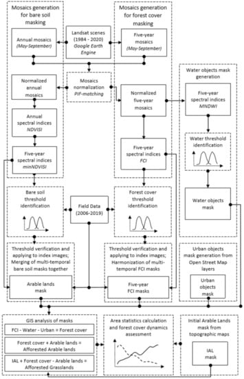 Figure 2 shows a flowchart of satellite, field and auxiliary data processing methods used in our study. Cloudless Landsat mosaics were generated via GEE (Section 2.3.1) and harmonized for further thematic processing (Section 2.3.2). Three spectral indices, each specifically designed for either forest, water or bare soil identification, were used for forest cover and arable lands mapping (Section 2.3.3). We used field data of 2006–2010 to identify a threshold for forest cover masking (Section 2.3.4). A visual interpretation of very high-resolution satellite images and ground-based grassland plots of 2006–2010 were used to identify a threshold for bare soil masking (Section 2.3.5). The accuracy assessment of forest and bare soil masking was performed based on field plots collected during 2016–2020 (Section 2.3.6). Additional thematic masks of water and urban objects was created (Section 2.3.7). All generated thematic products were combined together for afforestation dynamics assessment (Section 2.3.8 and Section 2.3.9).