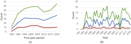 Minimum (red), median (blue) and maximum (green) clear measurements per pixel count for generated Landsat mosaics over study area: (a) five-year composites; (b) annual composites.