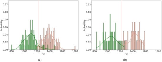 The left histogram (Figure 6a) shows the distributions of FCI index values frequency and profile curves of the forest and grassland sample points. There are two clear distinguished class-specific peaks, but the two distributions also overlap to some extent. The optimal FCI index threshold separating these two distributions, situated at the point of maximum Cohen’s Kappa, is estimated to be 1230. Corresponding to Cohen’s Kappa is 0.920, the observed proportionate agreement (observed probability) is 0.961 and the probability of random agreement (expected probability) is 0.515. Confusion matrix of “forest-grasslands” sample points is presented in Table 4.