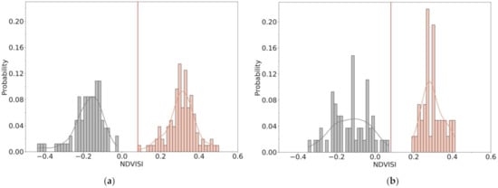 The threshold between two classes was determined by the integral minNDVISI image (2010). We created this product to maintain the maximum number of bare soil values in five years. The five-year 2010 index was created by selecting a minimum pixel value from five annual NDVISI images for a given time period (2006–2010). The five-year minimum NDVISI images for all other seven time periods were created by the same method.