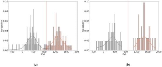 An assessment of the NDVISI threshold for bare soil masking was conducted in the same manner as the assessment of the FCI threshold. However, we used the five-year minNDVISI image, control points for grassland class from field observations database and the bare soil points visually identified on five-year mosaic image (2020). Geographic coordinates of the bare soil control points are provided in Table S2 of the Supplementary Materials.