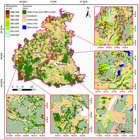 Therefore, the primary aim of our study was to develop a relatively simple and robust method to assess the spatial dynamics of forest cover on abandoned agricultural lands, based on Landsat time series analysis and limited field data. Additionally, to evaluate the efficiency of the developed method, we performed a comparative analysis of natural afforestation dynamics in two bordering regions of Russia and the Republic of Belarus over the past 35 years.