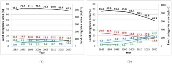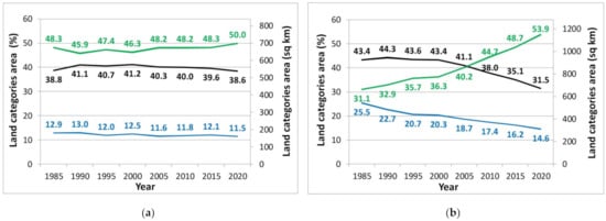 In the second case, arable lands were assigned from pixels within the boundaries of the administrative district using a mask of bare soil raster mask. All other pixels of the administrative district mask were assigned to other lands. Five-year forest masks intersected with arable lands and other administrative district lands to define areas of forests, arable land, and others. This procedure was performed for each five-year period. The calculated areas of all tree classes were normalized by the area of the administrative district.
