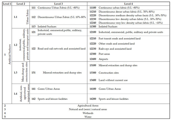 The European Urban Atlas is a dataset produced and supported by the European Space Agency (ESA) and the European Environment Agency (EEA). It provides standardized vector land-use and land-cover (LU/LC) data covering more than 700 Functional Urban Areas (FUAs) and their immediate rural vicinity, with more than 50,000 inhabitants across the EEA38 countries. The cartography of the Urban Atlas polygons is based on image interpretation of very high-resolution satellite data (2 m or 4 m spatial resolution). The LU/LC nomenclature is composed of 27 classes distributed in five major groups (Level 1) as described in Figure 3. Within each FUA, LU/LC polygons have a minimum mapping size of 0.25 ha for classes with class code 1, and 1 ha for classes with class code 2 to 5, which are spatially distributed in heterogenous patterns [62].