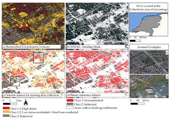 Example of reference dataset for a FUA located in Netherlands, with (a) reclassified Urban Atlas (UA) polygons according to Table 3 using three sub-classes, (b) WSF3D building mask overlapping Urban Atlas (UA) polygons, (c) interim dataset for training data collection and (d) binary reference dataset.