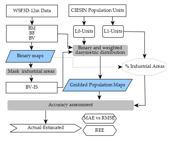 Figure 7 illustrates the workflow followed for the assessment of population models built on the basis of the original building mask (BM), building fraction (BF) and building volume (BV) layers of the WSF3D, and a combination of building volume and industrial settlement use information (exclusion of industrial settlements BV-IS).Accordingly, the main steps included the production of gridded population distribution datasets using top-down dasymetric modelling techniques, followed by a well-established quantitative accuracy assessment. These steps are described in more detailed in the following sub-sections.