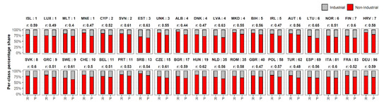Stacked bar plots showing the Persons’ correlation (r), and percentage shared of each class (grey: industrial, red: non-industrial) within the reference (R) and predicted (P) classification maps at the country level. Countries ordered according to the no. of available FUAs.