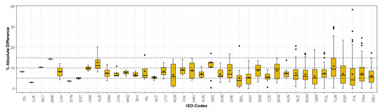 Box plots of the distribution of absolute difference in class proportions for all FUAs within a country. Middle line of each boxplot showing the position of the median difference, asterisk (*) showing the position of the average and yellow boxes showing the 75% inter-quantile range (IQR). Countries ordered according to no. of available FUAs.