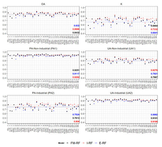 Confusion matrix average accuracy metrics reported in each country on the basis of the FM-RF (black points), I-RF (blue crosses) and E-RF (red crosses) models. First row: overall accuracy (OA) and kappa coefficient (K). Following rows: producers “accuracy (PA) and Users” accuracy (UA) for class 1: Non-Industrial (left), class 2: Industrial (right). Pan-European results represented by the average lines and bold numbers. Countries ordered according to no. of available FUAs.