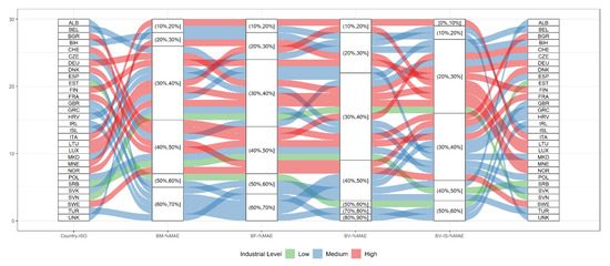 In terms of the Producer’s Accuracy (PA) for class 1: non-industrial and class 2: industrial, results reveal that in 37 of the 38 countries, the PA of class 1 was close or higher than 90%, with the lowest metrics of 85% reported in MLT and the highest value of ~95% reported in ISL, SVN, NOR, HRV, GRC and HUN, respectively. Conversely, the PA of class 2 was higher or equal to 80% for 23 countries and between 70% and 80% for the rest of the countries. The highest value of ~87% was reported in LTU and the lowest value of ~72% was reported in MLT and GBR, respectively. Overall, at the Pan-European scale the PA of the non-industrial and industrial classes, reached an average of 92% and 79%, respectively. Accordingly, results reveal than in 21 of the 38 countries, the User’s Accuracy (UA) of class 1 was higher or equal to 80%, between 70% and 80% for nine countries, and below 70% for eight countries. The highest value of ~87% was reported in LTU, and the lowest value of ~65% was reported in MLT and GBR, respectively. Conversely, the UA of class 2 was higher, equal or close to 90% for 36 of the 38 countries. The highest value of 95% was reported in HRV, and SVK, and the lowest value of ~82% was reported in MLT, respectively. Overall, at the Pan-European scale, the UA of the non-industrial and industrial classes, reached averages of 76% and 91%, respectively.