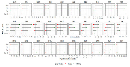 On the one hand, for a given country, the Mean Absolute Error (Equation (2)) and Root Mean Square Error (Equation (4)) () both measure the average of the absolute differences between the actual ( and estimated population counts of the L1 units. However, unlike the RMSE, which penalizes larger errors by squaring the differences, the MAE weights each error equally, allowing the identification of outliers in the data. On the other hand, the percentage MAE (Equation (3)), which is the MAE divided by the average population of each country, allows the comparisons across countries by removing the bias of different population totals and number of L1 units. This metric can be used to determine if the errors/improvements generated by the different proxy layers are similar and systematic, or if different behaviors are observable across countries.