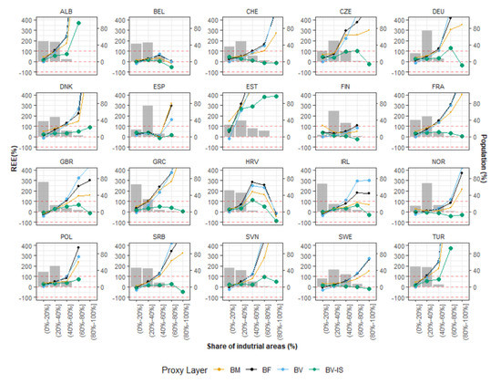 - Firstly, for each country we calculated the proportion of industrial areas found within the L1 units according to the final binary classification maps. For all L1 units with the same amount of industrial presence, we then calculated the average REE produced by each gridded population map.