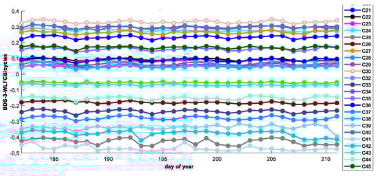 As the WL FCB is relatively stable, only one value per day can be estimated. In this paper, we used the MW combination to calculate BDS-3 WL FCB. The time series of WL FCB over the day-of-year (DOY) period of 182–213 are shown in Figure 4.