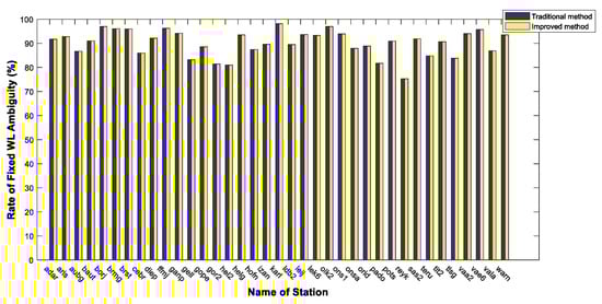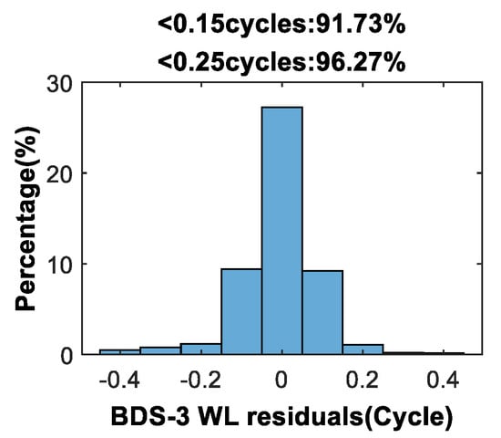 The rate of fixed NL ambiguities is only 78% in this paper, although the rate of the fixed epoch is more than 90%. The accuracy of BDS-3 orbit and clock products is one of the important reasons for this rate; another reason may be the lower rate of fixed WL ambiguities. The rate of fixed WL ambiguities is shown in Figure 16.