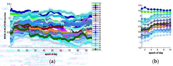 We counted the calculated time of the program when estimating NL FCB by different methods. As shown in Table 2, in the same environment (such as software, computer, number of stations, data, etc.), the calculated time of the traditional method is 27386 seconds, and the calculated time of the proposed method is 17881 seconds. The calculated time is the average time over 10 runs. Therefore, the computational efficiency of NL FCB increases by about 34.71% when using the proposed method. Figure 6b and Figure 7b show 1–10 epochs of NL FCB by the traditional and proposed methods, which are also included in the overall epochs in one day, shown in Figure 6a and Figure 7a. We can see that the NL FCB of the traditional method needs about four epochs to be stable. From Figure 7b, the NL FCB of the proposed method is more stable in 1–10 epochs.