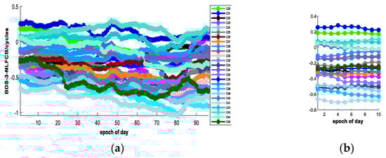 NL FCB of BDS-3 estimated by using the improved fast method (reference satellite is C19) as (a) NL FCB of all epochs in one day; (b) NL FCB of 1–10 epochs in one day.