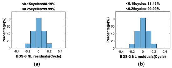 Distribution of float posteriori NL ambiguity residual errors (2021, day 185) as (a) posteriori residual errors when estimating NL FCB with traditional method; (b) posteriori residual errors when estimating NL FCB with proposed method.