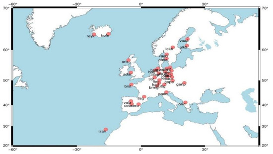 In order to analyze the performance of FCB, estimated by the proposed method, we carried out some static and dynamic PPP–AR experiments by using the data of European reference stations and comparing them with the traditional method. The European reference stations are distributed, as shown in Figure 9.