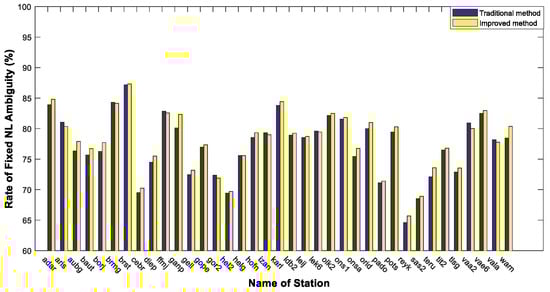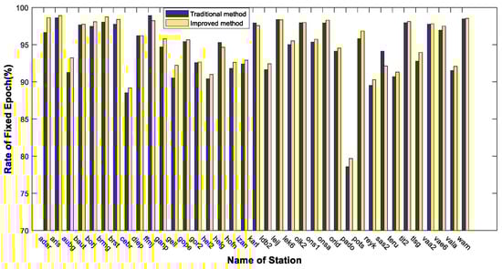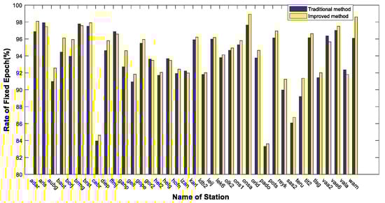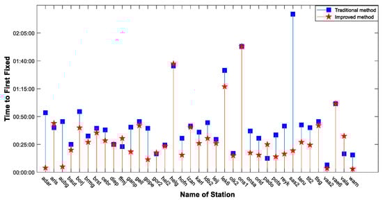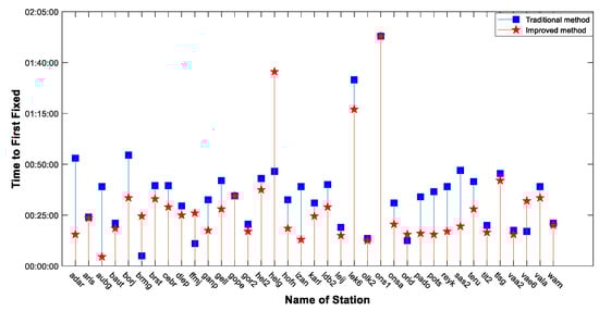 From Figure 10, the of most stations is more than 90%, and the mean that uses the traditional and proposed methods are 94.50% and 94.96%, respectively. The of the proposed method is 0.5% more than in the traditional method. From Figure 11, the values using the traditional and proposed methods are 77.61% and 78.03%, respectively. The mean of the proposed method is 0.5% more than in the traditional method. Therefore, the proposed method offers an improved precision compared to the traditional one. We also counted the time to first fixed (TTFF) of the stations, and the results are shown in Figure 12.