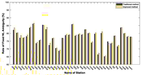 We did not address the rate of fixed WL ambiguities in the experiment due to the same method when estimating WL FCB. Figure 16 depicts that the mean rate of fixed WL ambiguities is 90.17%. In this paper, we estimated FCB by using the B1I/B3I signal of BDS-3. It is expected to further improve the rate of fixed WL ambiguities by using the B1C/B2A signal of BDS-3, due to the new signal having more precise observations [19]. It can also improve the rate of fixed NL ambiguities and the reliability of PPP–AR.