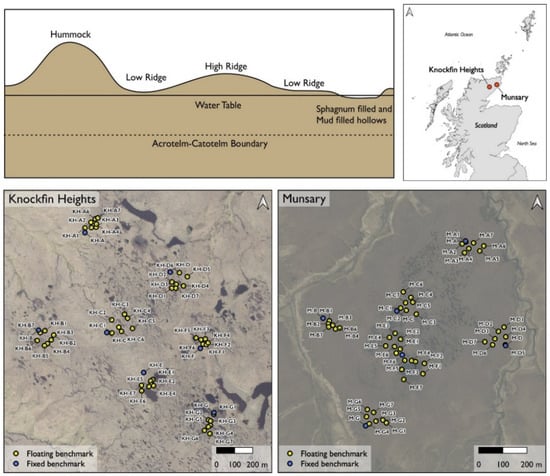 The raw data used in this study and a detailed description of the sampling protocols are available at [35]. Briefly, an approximately 1 km2 area was selected on the basis of previous InSAR measurements [31], aerial photography and site visits at both Munsary (M) and Knockfin Heights (KH; Figure 1). At each site, seven subsites given a letter A-G and notional area 100 × 100 m were selected representing the range of subsidence rates (from InSAR) and peat morphology (from aerial photography) (Figure 1). At each subsite, a permanent fixed benchmark was installed, in the form of a metal rod firmly embedded to the underlying substrate. Within each subsite, seven locations (hereafter coded 1–7) representative of the peat microtopography and vegetation were selected for 500 mm long floating benchmarks. At Knockfin Heights these comprised hummocks, lawns, hollows and bare peat at pool margins and between peat hags (i.e., overhanging remnants of peat). At Munsary, the floating benchmark locations comprised hummocks, lawns, and hollows. This layout allowed the consistent measurement of the floating benchmarks relative to the permanent site benchmark and its underlying substrate at each site. A description of each benchmark is available at [35]. A schematic diagram of the microtopographic classification used can be seen in Figure 1.