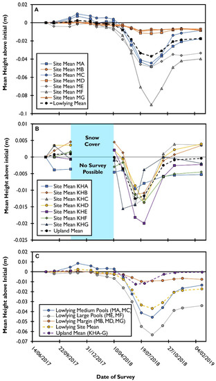 At both low lying medium pool subsites (M-A and M-C), benchmarks show a general trend of decreasing amplitude following mud filled hollows < hollows <low ridge < high ridge < hummocks (Figure 3). This strong microtopographic control is particularly pronounced during the drought period. An exception is benchmark M-C2 which remained relatively stable during the drought period and showed behavior comparable with benchmarks from the peatland margins (sites M-B, M-D and M-G). This benchmark overlies an area of shallower peat without pools, associated with an underlying topographic high, identified previously from peat probing. Overall medium pools exhibit relatively dynamic seasonal behavior compared to peatland margins and upland peats (Figure 2).
