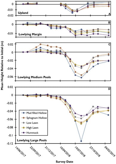 PSM is a mechanical expression of many factors used to evaluate peat condition, such as water balance, vegetational assemblage, erosion and density [18,19,20,21,22,23,24] This phenomenon, sometimes referred to as “bog breathing”, is well recorded, and an example of PSM that indicates an interannual sensitivity to seasonal changes in water balance. The sensitivity of PSM to short term changes (e.g., drainage, drought) means that unlike other measures of peat condition e.g., vegetational succession which have long lag times (years) before changes can be observed, deterioration or improvement in the condition of a peatland can be observed over the short term (days-years) [5]. This is useful as it forewarns longer-term ecological change and carbon loss. As such PSM is an important, if not underutilized, proxy for overall peatland condition.