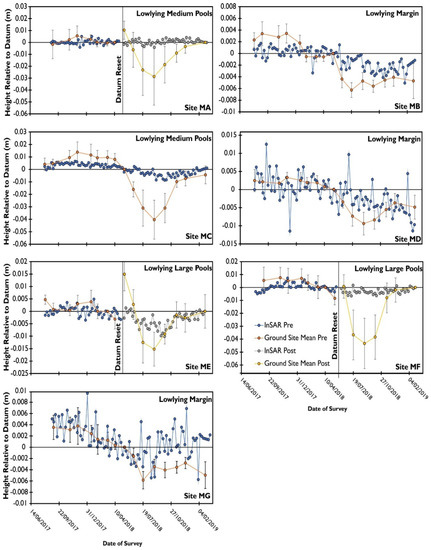 Both sites show strong evidence of seasonal motion with peak surface height achieved in late November and minimum values in late August (2017–2018; Figure 2). Both M-A and M-C show inter-seasonal ranges between 0.02 and 0.09 m for 2017–18 with mean values of 0.055 and 0.045 m, respectively. Sites M-A and M-C show a mean difference between pre and post drought peak surface height of approx. −0.01 mm and −0.025 m, respectively. Both sites show an overall subsidence trend over the survey period although at a lower rate than seen at sites M-E and M-F.
