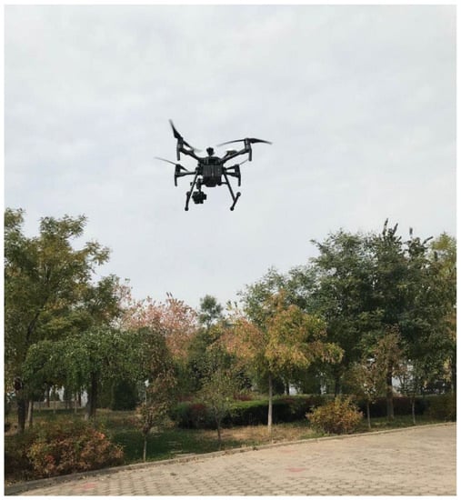 This test uses DJI Jingwei M210 RTK UAV as the flight platform. Its horizontal and vertical positioning accuracy reaches ±0.1 m, and the platform is equipped with an XT2 dual-light thermal imaging lens, which can simultaneously collect visible light images and thermal infrared images. The thermal imaging camera uses an uncooled vanadium oxide (VOx) micro-pyrometer as the thermal imager; the visible light camera uses 1/1.7” CMOS as the sensor, with an effective pixel of 12 million. The photo of the UAV is shown in Figure 2. When collecting the image data of the study area, an open area should be selected for the aircraft to take off and land; at the same time, the image data collection time should be carried out when the light conditions are better. When UAV data was collected, the wind speed was 1–2 m/s and the temperature was moderate. There was no rain in the study area one week before data collection. Before image collection, set the route parameters according to the test requirements. The course overlap degree and side overlap degree are set to 85%, the flying height is 120 m, the route speed is 5.0 m/s, the route flight time is about 75 min and the image spatial resolution is about 0.03 m. Data preprocessing of the data collected in the field mainly includes image stitching using Pix4D mapper and image cropping using ENVI5.3, and finally an orthophoto of the study area is obtained.