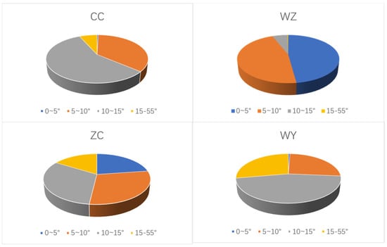Divide the temperature of the four coal gangue piles into a pie chart, as shown in Figure 4. The temperature of CC is mostly concentrated at 10–15°, the temperature of WZ is mostly concentrated at 5–15°, the temperature of ZC is 15–55° accounting for 16.23%, the temperature of WY is between 15° and 55° and accounts for 27.79%. In general, the average temperature of coal gangue piles (ZC and WY) that have experienced spontaneous combustion is higher than that of gangue piles that have not experienced spontaneous combustion. The spontaneous combustion coal gangue pile (WY) is higher than that of the coal gangue pile (ZC) where spontaneous combustion has occurred.