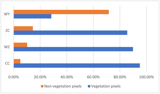 The visible light images of the drone are stitched to obtain vegetation pixel data (Figure 5). The image vegetation pixels of CC are 94.98%, the WZ image vegetation pixels are 89.83%, the ZC image vegetation pixels are 85.51%, and the WY vegetation pixels are 28.37%. There are more vegetation pixels in coal gangue piles without spontaneous combustion than coal gangue piles with spontaneous combustion.