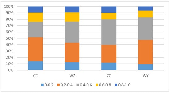 The vegetation coverage of the four gangue piles is made into a histogram, as shown in Figure 7. CC accounted for 24.13% of vegetation coverage between 0.6 and 1.0, WZ accounted for 23.9%, ZC accounted for 20.09% and WY accounted for 17.3%. At the same time, it also proved that unburned coal gangue piles have better vegetation coverage.
