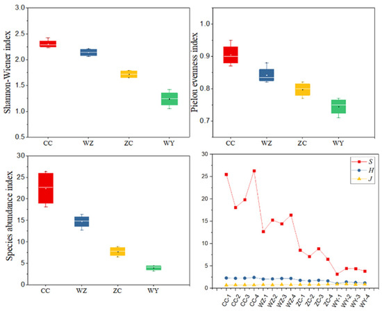 Integrate vegetation survey information such as the number of species, individuals, and distribution characteristics, and calculate the plant community species diversity index (Shannon-Wiener index H, Pielou’s index J and Species abundance index S). Figure 8 shows the species diversity characteristics of coal gangue piles with different degrees of spontaneous combustion. The Shannon–Wiener index H ranges from 1.05 to 2.42, with the highest point in CC and the lowest point in WY. The average CC, WZ, ZC and WY values are 2.31, 2.14, 1.72 and 1.24, respectively. The Pielou’s index ranged from 0.71 to 0.95, with the highest CC point and the lowest WY point. 0.75, 0.80, 0.84 and 0.91 are the average values of WY, ZC, WZ and CC, respectively. The Species abundance index ranges from 3.17 to 26.32, with the highest point in CC and the lowest point in WY. The average values of CC, WZ, ZC and WY are 22.44, 14.16, 7.76 and 3.97, respectively. In general, the species diversity index of CC and WZ communities fluctuates slightly. Both are higher than ZC and WY, indicating that CC and WZ have the most vegetation types and the highest degree of community complexity, and the community distribution is relatively even.