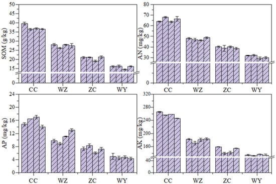 The soil nutrients of coal gangue piles with different levels of spontaneous combustion are shown in the Figure 10. The average soil organic matter contents in CC, WZ, ZC and WY were 36.59 g/kg, 27.38 g/kg, 20.62 g/kg and 15.75 g/kg, respectively. The average soil available nitrogen content was 65.56 mg/kg, 47.60 mg/kg, 39.51 mg/kg and 30.89 mg/kg. The average available phosphorus content was 15.58 mg/kg, 10.70 mg/kg, 7.23 mg/kg and 4.68 mg/kg, respectively. The average available potassium content in soil was 256.83 mg/kg, 179.21 mg/kg, 148.53 mg/kg and 133.75 mg/kg, respectively. Compared with spontaneous combustion coal gangue piles, the soil organic matter, available nitrogen, available phosphorus, and available potassium are relatively higher in unspontaneous combustion coal gangue piles. The nonparametric test (Kruskal–Wallis method) on the soil nutrients of coal gangue piles with different spontaneous combustion levels showed that there are significant differences in soil organic matter, available nitrogen, available phosphorus and available potassium in coal gangue piles with different levels of spontaneous combustion (p < 0.05).