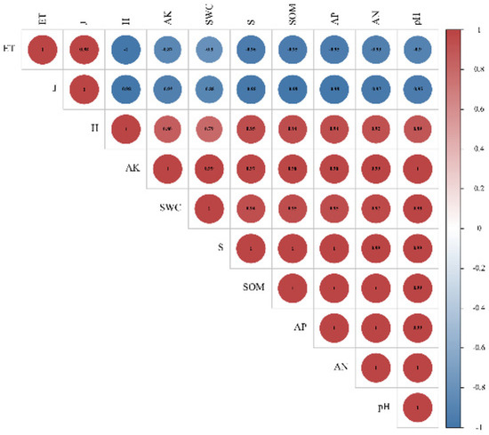 Pearson’s correlations analysis was conducted between plant community species diversity index and soil properties (Table 3). The results showed that plant community diversity was significantly correlated with soil properties (p < 0.05), Shannon–Wiener index and Species abundance index were significantly negatively correlated with ground temperature, and significantly positively correlated with other soil properties; Pielou’s index was positively correlated with ground temperature Related. Furthermore, the correlation between the soil physicochemical properties and plant community species diversity index was analyzed (Figure 12). Consistent with the above.