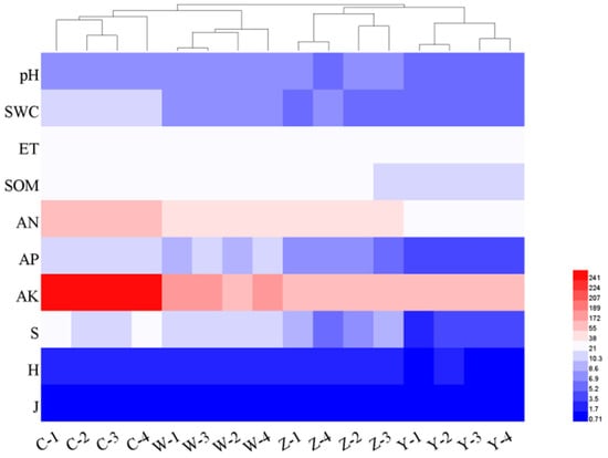Clustering heat map of coal gangue pile plant and soil index. SWC: soil water content; ET: effective soil temperature; SOM: soil organic matter; AN: total nitrogen; AP: available phosphorus; AK: available potassium; H: Shannon–Wiener index, J: Pielou’s index; S: Species abundance index. Euclidean distance was used for both row and column distance measurement.