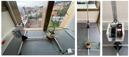 In order to properly acquired a model of the plan, a mechanical structure was designed and constructed entirely of modular aluminum to ensure that it can be disassembled and easily transported. In addition, the structure has a rail system that allows the sensors (multispectral camera and LiDAR) to move vertically on a 1.8 m aluminum profile and to move the rotating base closer or farther from the sensors on a 2 m aluminum profile. Additionally, it has leveling screws on the four legs of the platform, in order to adjust the inclination of the mechanical structure. In comparison with the structures in other investigations (Thapa et al. [19], Sun et al. [12,20], Zhang et al. [15]), the proposed structure (shown in Figure 2) is able to freely move both the sensors and the rotating base over the rails system allowing the phenotyping of plants with a height up to 2.5 m, regardless of their structure.