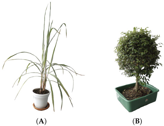 Plants used for the experimentation stages of this work: (A) The Limonaria (Cymbopogon citratus), (B) The Guaiacum bonsai (Cuaiacum officinale).
