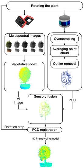 Considering this, we proposed the development of a flexible and portable phenotyping platform, fusing low-density LiDAR data and multispectral imagery to generate four-dimensional plant models. With that purpose, we utilize the Velodyne’s VLP-16 LiDAR and the Parrot’s Sequoia multispectral camera, and by integrating a novel set of mechanisms that also involves the calibration of the intrinsic and extrinsic parameters of these sensors, we are capable of implementing a sensory fusion that allows us to generate 4D phenotyping models where morphological and biochemical parameters of plants can be estimated.